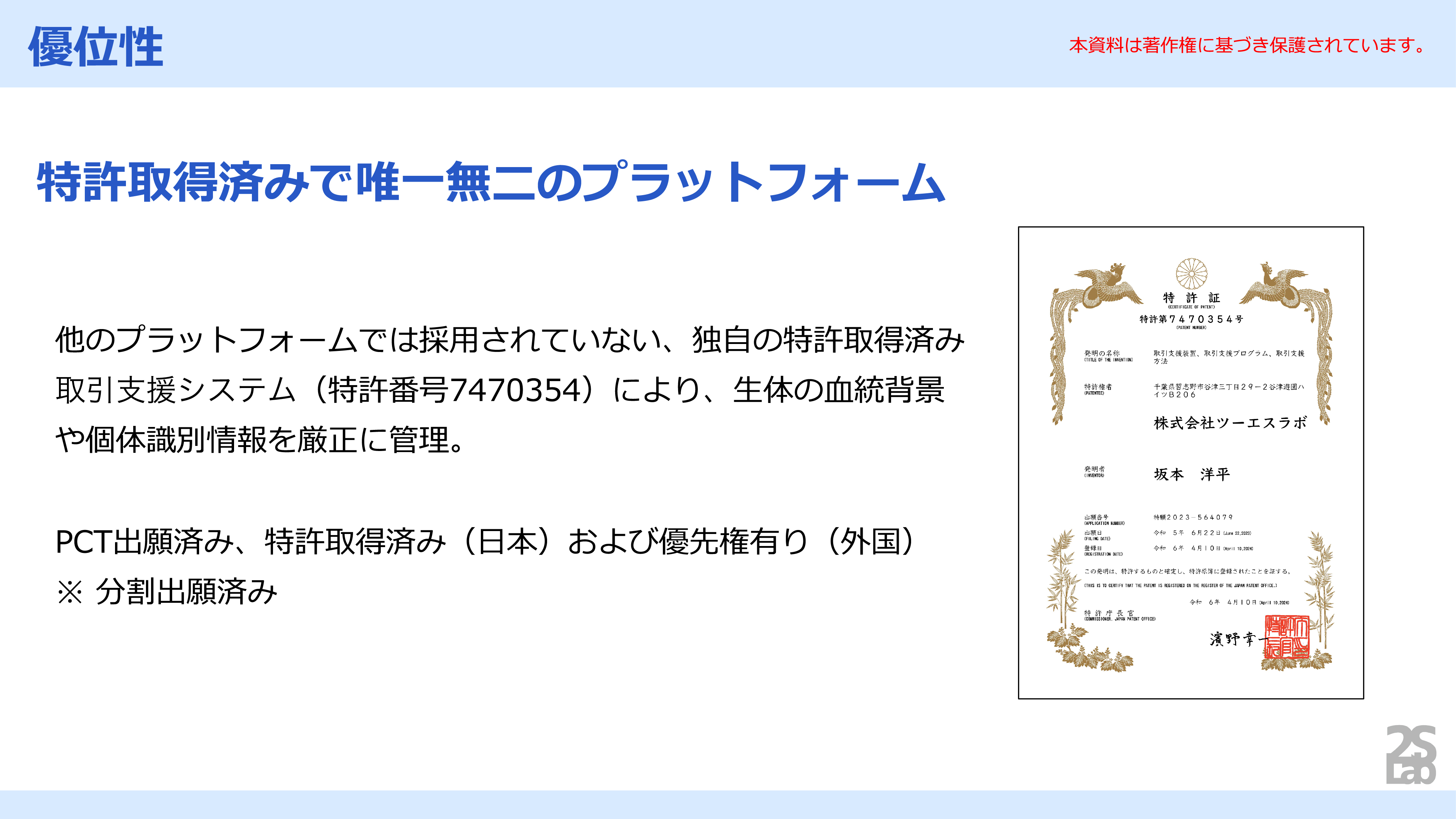 ※ Pedigree Tokenは、特許第7470354号に基づくスマートコントラクトによる自動報酬分配技術を応用したゲノムデータ管理用の限定ユーティリティトークンです。
